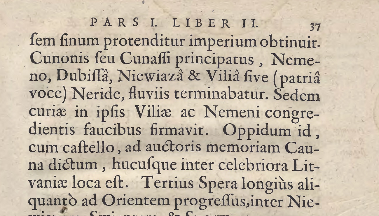 По малых часЂх умре брат его, которыи мешкал на Юрборку, не имЂючи дЂтеи, и брат его Кунос возмет и тую часть брата своего Борка и город Юрборк, и в тои части его будет пановати. И онои княжа Кунос имЂл двух сынов, одного Кернуса, a другаго Кгинбутья. И пануючи ему в земли Жомоитскои, почал ся множити и разширяти и выходити на реку Велию, в землю Завелскую. И прошедши рЂку Светую. вышел и нашел мЂстцо велми хорошо, и сподобалося ему то мЂстцо велми, и он там поселил сына своего Кернуса, и назвалося то мЂстцо по Керну\л.17.\се Керново, a потом Кунос умре. И по нем почнет сын его Кернус пановати на всеи земли Завелскои по границу Латыгонъскую и по Завелскии Браславль, аже по реку Двину. A брат его Кгинбут на Юрборку и на Куносове, и на всеи земли Жомоитскои. A в тот час, гдЂ Кернус пановал на Завелскои сторонЂ, людие тыи его, што за Велею осЂли, игрывали на трубах дубасных, и прозвал тот Кернус берег своим языком власным, по-латыне, литус, гдЂ ся люди его множат, a трубы, што на них играют, туба. И дал имя тым людем своим \л.17об.\ языком по-латыне, сложивше берег c тробою Г: Литусба. И простыи люди не велели Д звати по-латыне и почали звати просто Литвою, и от того часу почалося звати панство Литовское и множити от Жомоити